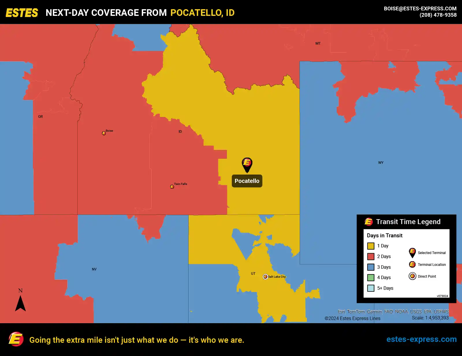 Estes offers next-day LTL freight shipping from the Pocatello-Idaho Falls area to Salt Lake City.