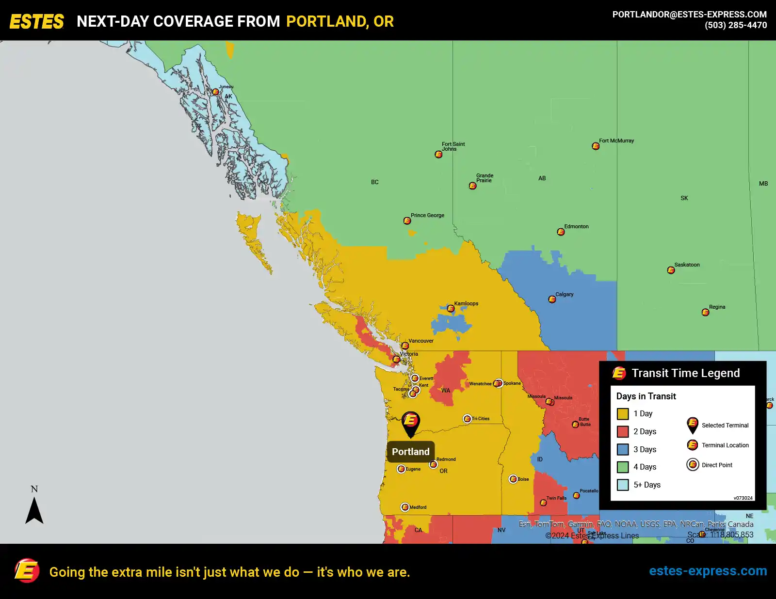 Estes also offers reliable next-day LTL shipping from Portland to Vancouver—supported by our nationwide team of Border Concierges and featuring some of the best freeze protection in the industry!