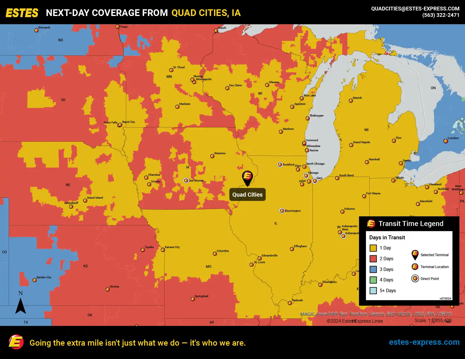 Estes offers next-day LTL freight shipping from the Quad Cities—including Davenport, Bettendorf, Rock Island, Moline, and East Moline—to destinations across the Midwest.