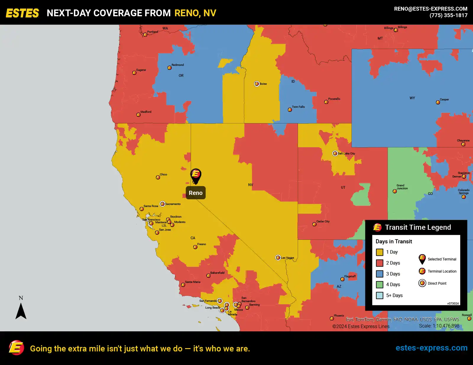 Estes offers next-day LTL freight shipping from the Reno-Sparks area to Los Angeles, San Francisco, San Jose, Las Vegas, Salt Lake City, Sacramento, Fresno, Boise, Riverside, Modesto, Chico—and more.