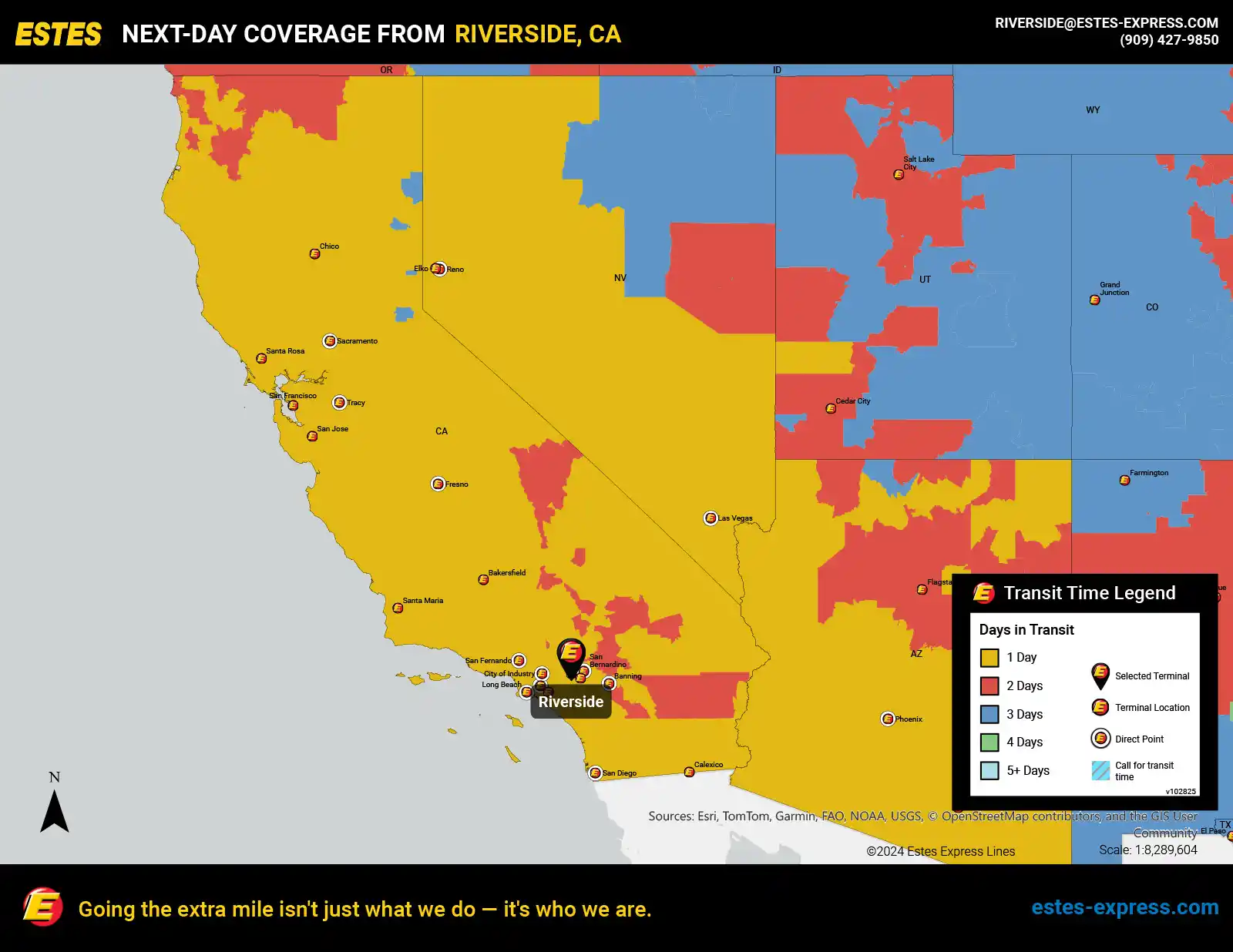 Estes offers next-day LTL freight shipping from the Riverside-Corona-Rancho Cucamonga area to Los Angeles, Phoenix, San Diego, San Francisco, Las Vegas, San Jose, Sacramento, Fresno, Reno, Tucson, Bakersfield, San Bernardino, Chico—and more.