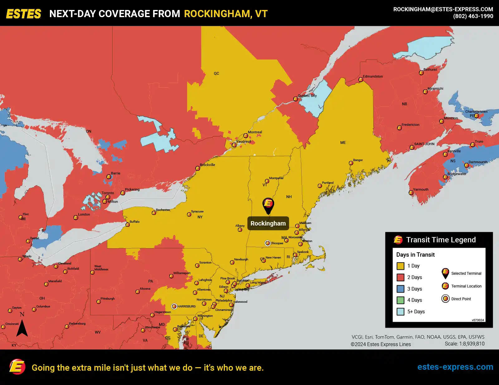 Estes also offers reliable next-day LTL shipping from the Rutland area to Montreal and other Quebec destinations. Our nationwide team of border experts is available round-the-clock to help you navigate language barriers and cross-border documentation. And with more than 500 heated trailers dedicated to our U.S.-to-Canada next-day lanes, we offer some of the best freeze protection in the LTL industry.