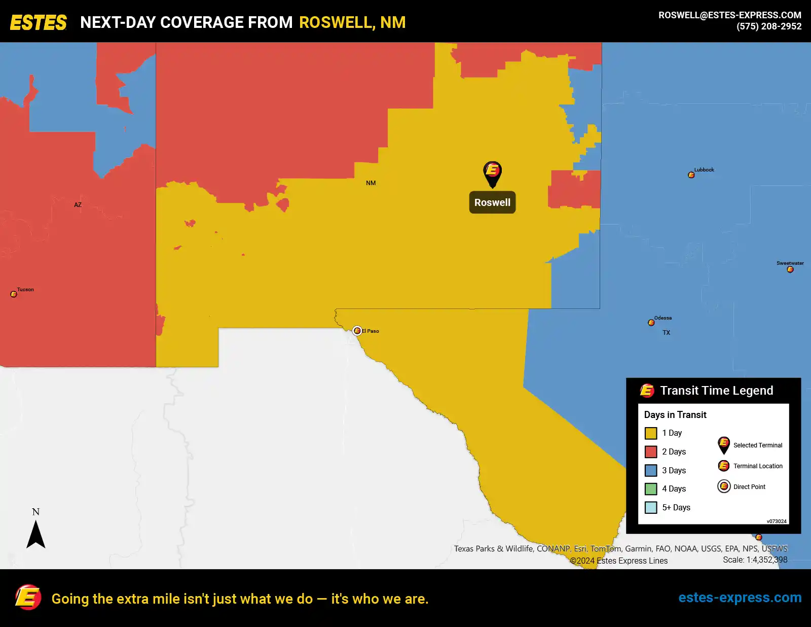 With nearly 7000 next-day LTL freight lanes and 295+ terminals, Estes can move Roswell’s freight with ease.