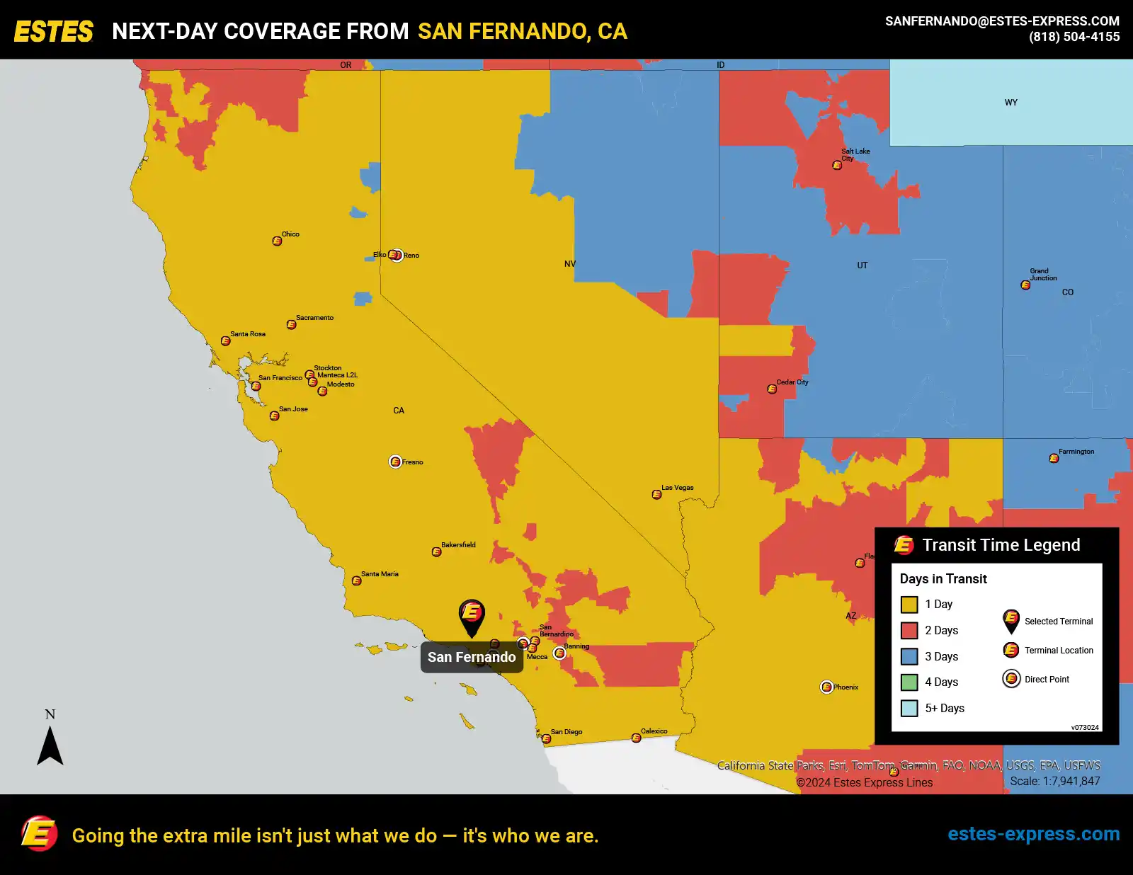 Estes offers next-day LTL freight shipping and trucking services from the Glendale-Lancaster-Ventura area to Los Angeles, Phoenix, San Diego, San Francisco, Las Vegas, San Jose, Sacramento, Fresno, Riverside, San Bernardino, Reno, Bakersfield, Chico—and more.