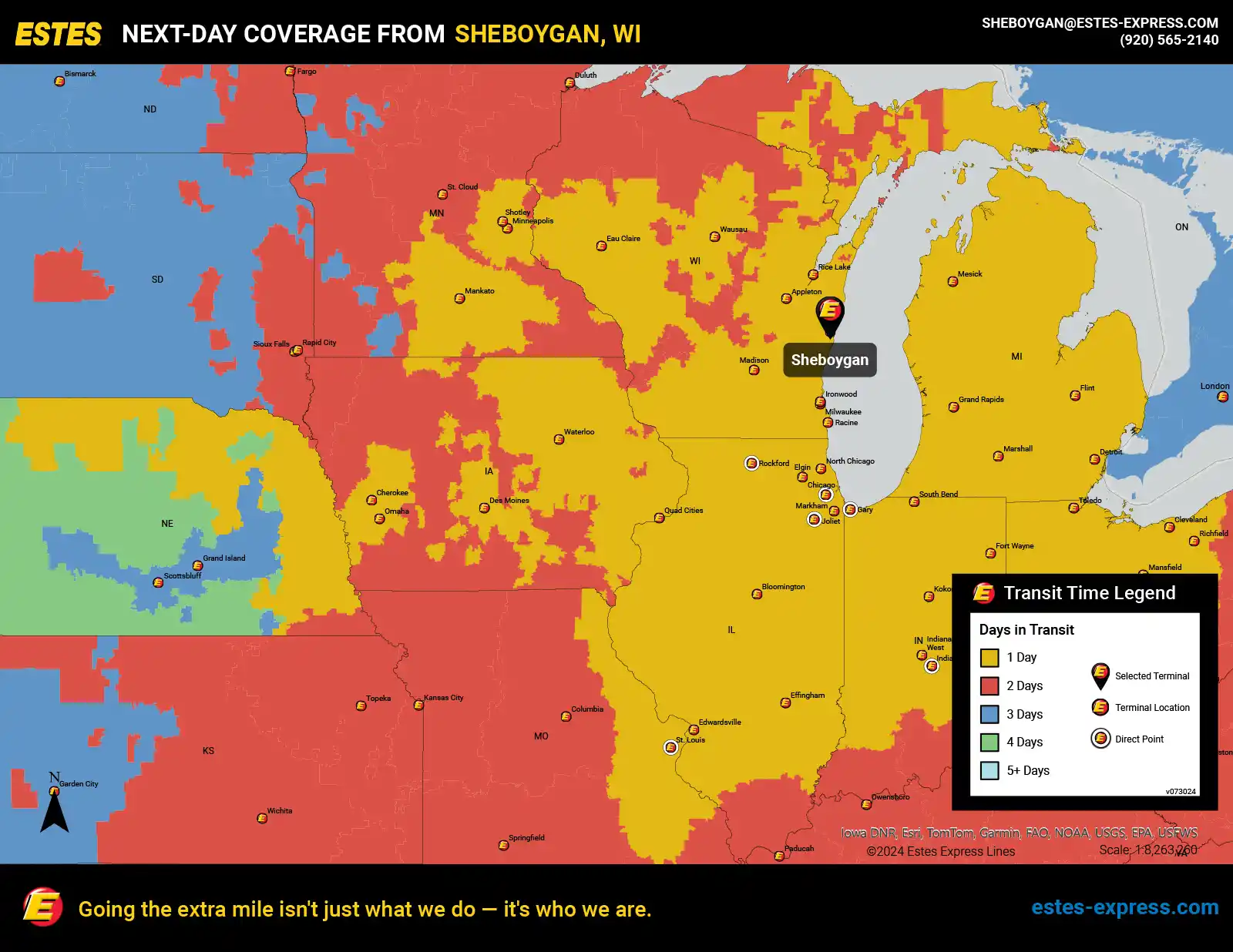 Estes offers next-day LTL freight shipping from the Sheboygan-Mequon area to Chicago, Indianapolis, Detroit, Cleveland, Milwaukee, St. Louis, Columbus, Dayton, Grand Rapids, Rockford, Flint, South Bend—and more.