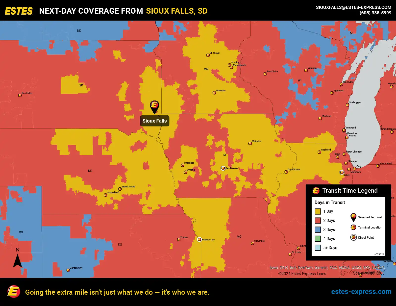 Estes offers next-day LTL freight shipping from the Sioux Falls-Sioux City area to Kansas City, Omaha, Des Moines, Rockford, Cedar Rapids—and more.