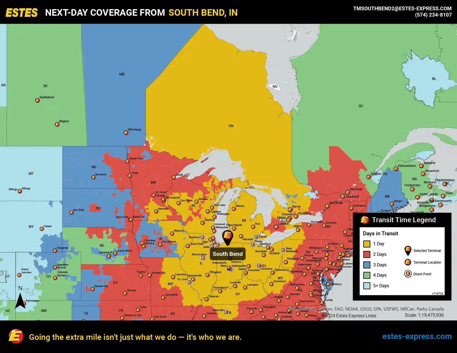 Estes offers next-day LTL freight shipping from South Bend to Chicago, Indianapolis, Toronto, Nashville, Cleveland, Cincinnati, Columbus, Pittsburgh, Detroit, Milwaukee, St. Louis, Buffalo, Louisville—and more.