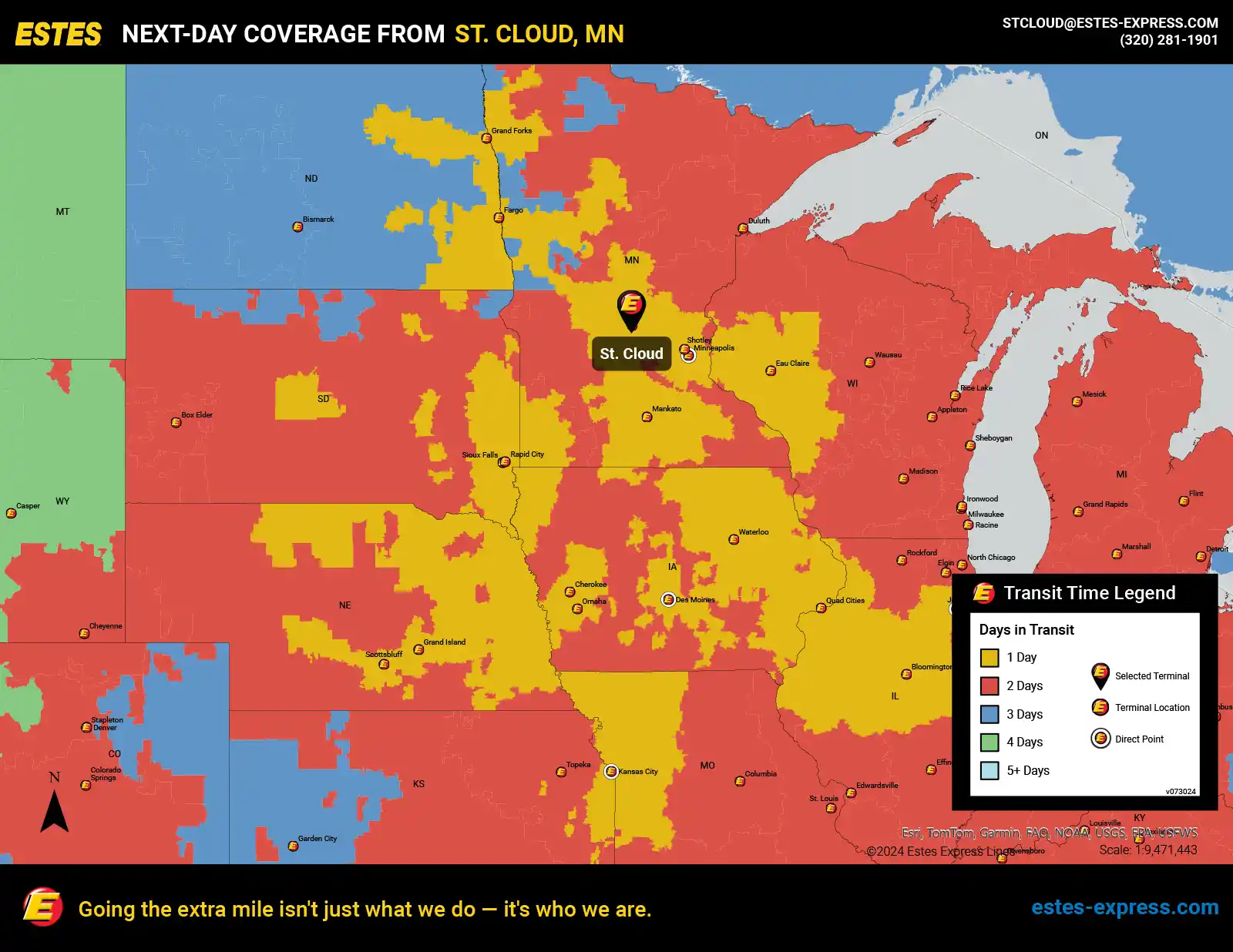 Estes offers next-day LTL freight shipping from the St. Cloud area to Minneapolis, Kansas City, Omaha, Des Moines, Fargo, Sioux Falls, Joliet, Quad Cities—and more.