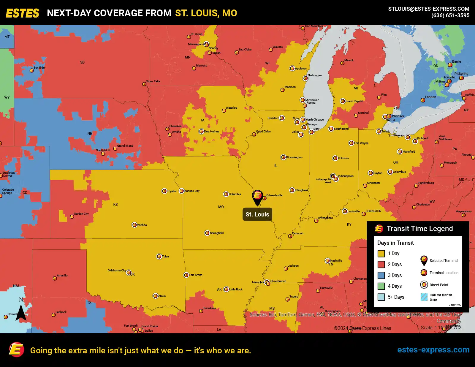 Estes offers next-day direct LTL freight shipping from St. Louis to Chicago, Kansas City, Indianapolis, Nashville, Detroit, Oklahoma City, Cleveland, Columbus, Tulsa, Memphis, Louisville, and Des Moines, as well as next-day LTL to Cincinnati, Lexington, and more.