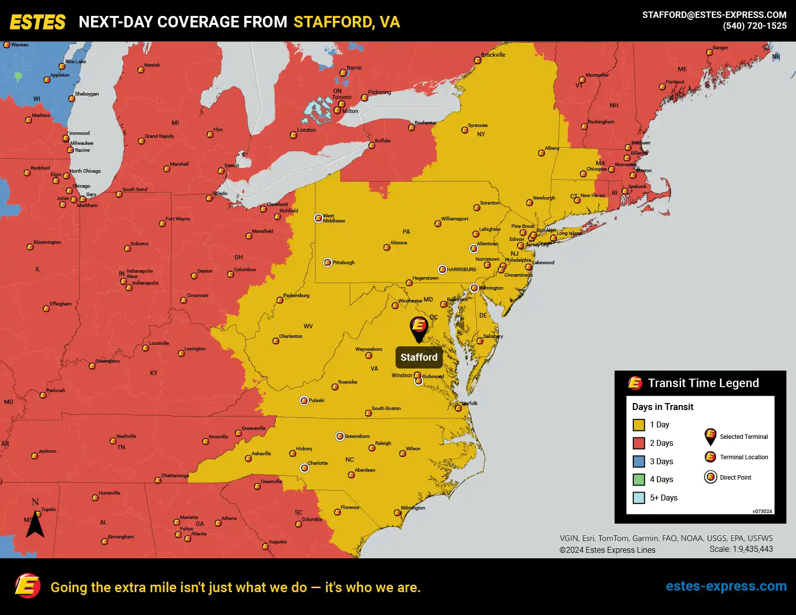 Estes offers next-day LTL freight shipping from Arlington, Alexandria, and Northern Virginia—including Reston, Fredericksburg, Manassas, Woodbridge, McLean, and Centreville—to destinations throughout the east.