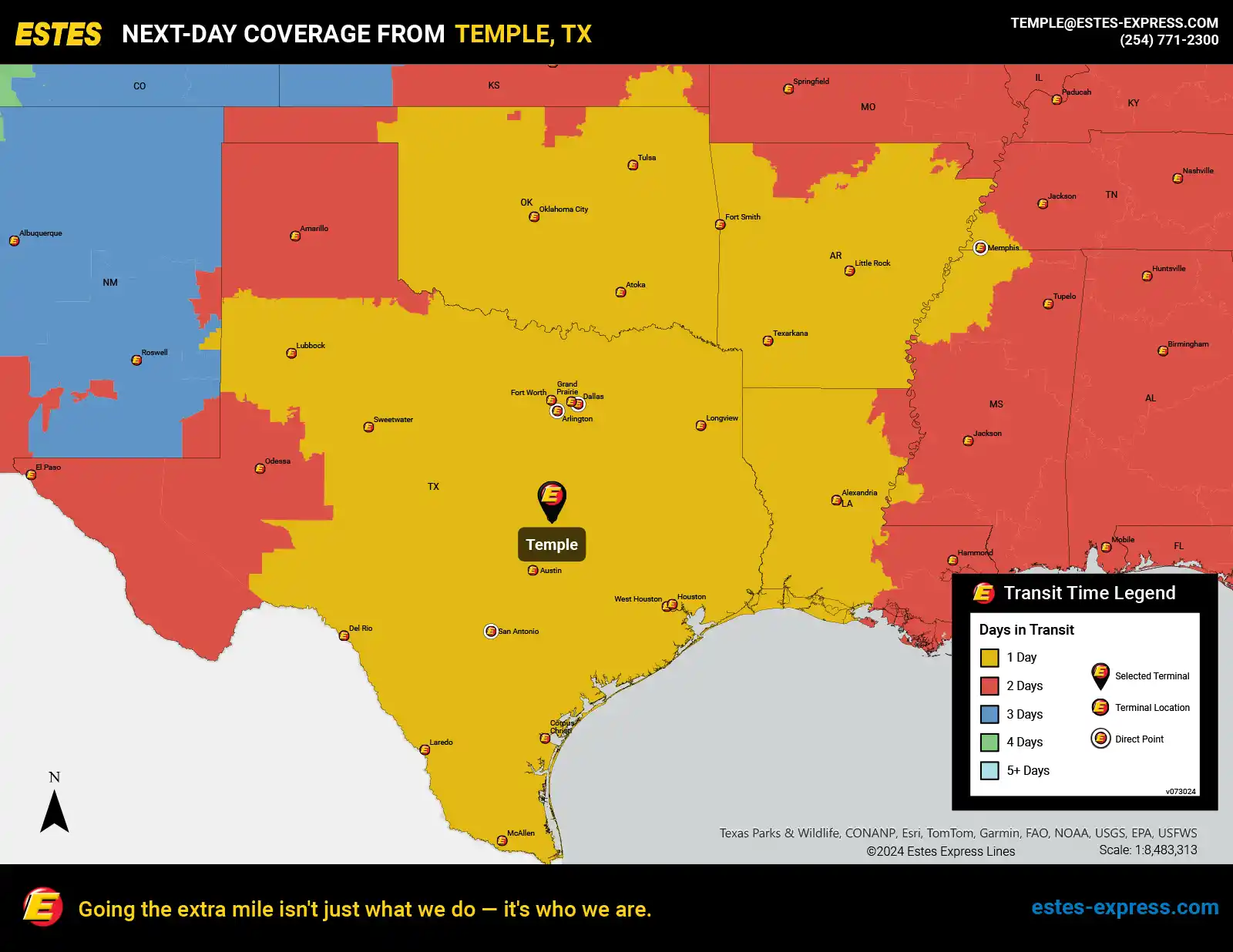 Estes offers next-day LTL shipping from the Waco-Temple area to Houston, Dallas, San Antonio, Austin, Fort Worth, Oklahoma City, Memphis, Tulsa, Little Rock, McAllen—and more.