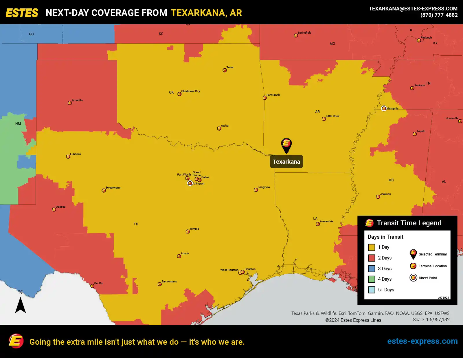 Estes offers next-day LTL freight shipping from the Texarkana area to Houston, Dallas, San Antonio, Austin, Fort Worth, Oklahoma City, Memphis, Tulsa, Little Rock—and more.