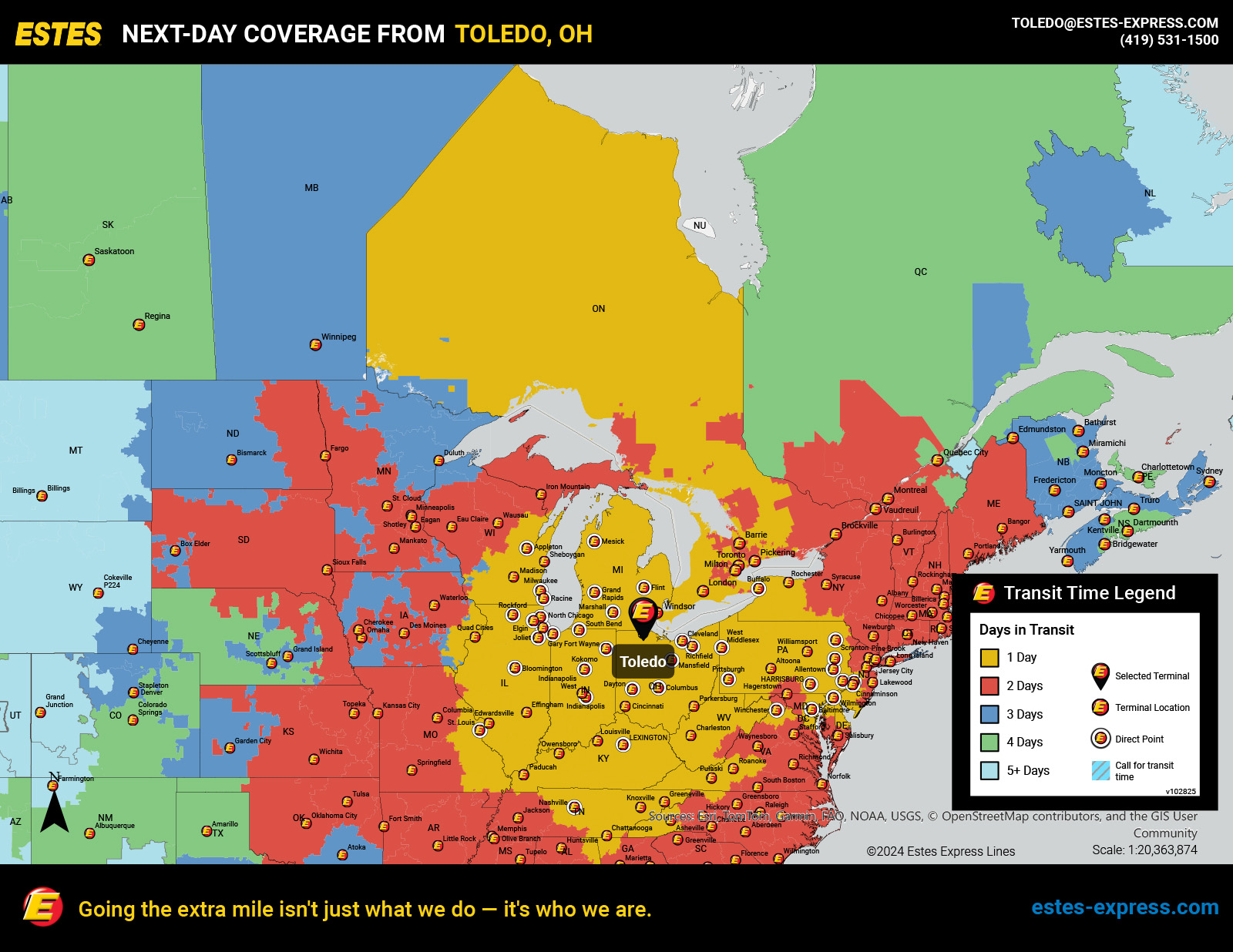 Estes offers reliable next-day LTL shipping into Toronto from the Midwest and Northeast, and into London, and Windsor from the upper Midwest, as well as southbound next-day service from Toronto to the Midwest—all supported by our nationwide team of Border Concierges and featuring some of the best freeze protection in the industry.