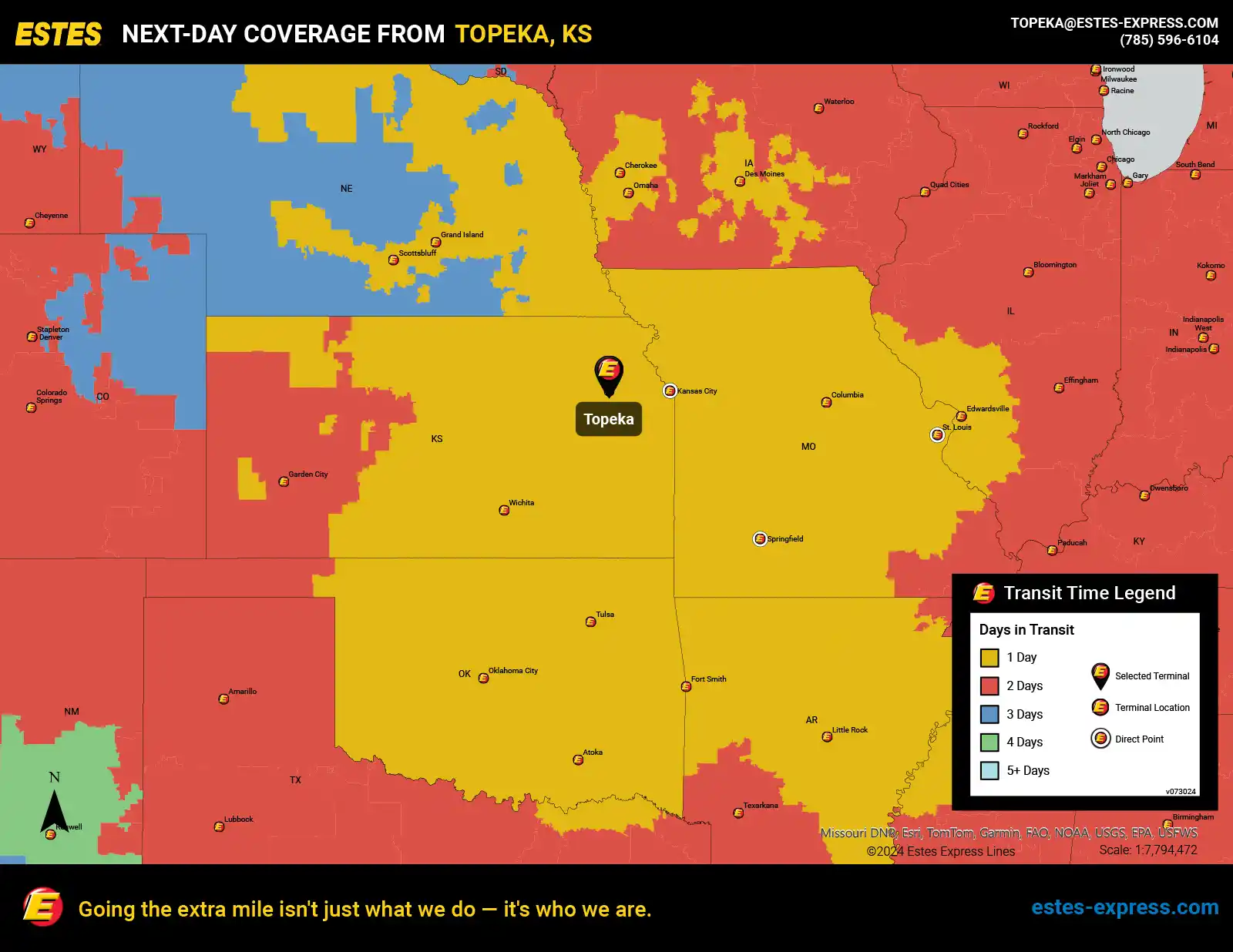Estes offers next-day LTL freight shipping from the Topeka-Lawrence-Manhattan area to Oklahoma City, Kansas City, Tulsa, Memphis, St. Louis, Omaha, Wichita, Columbia, Springfield—and more.