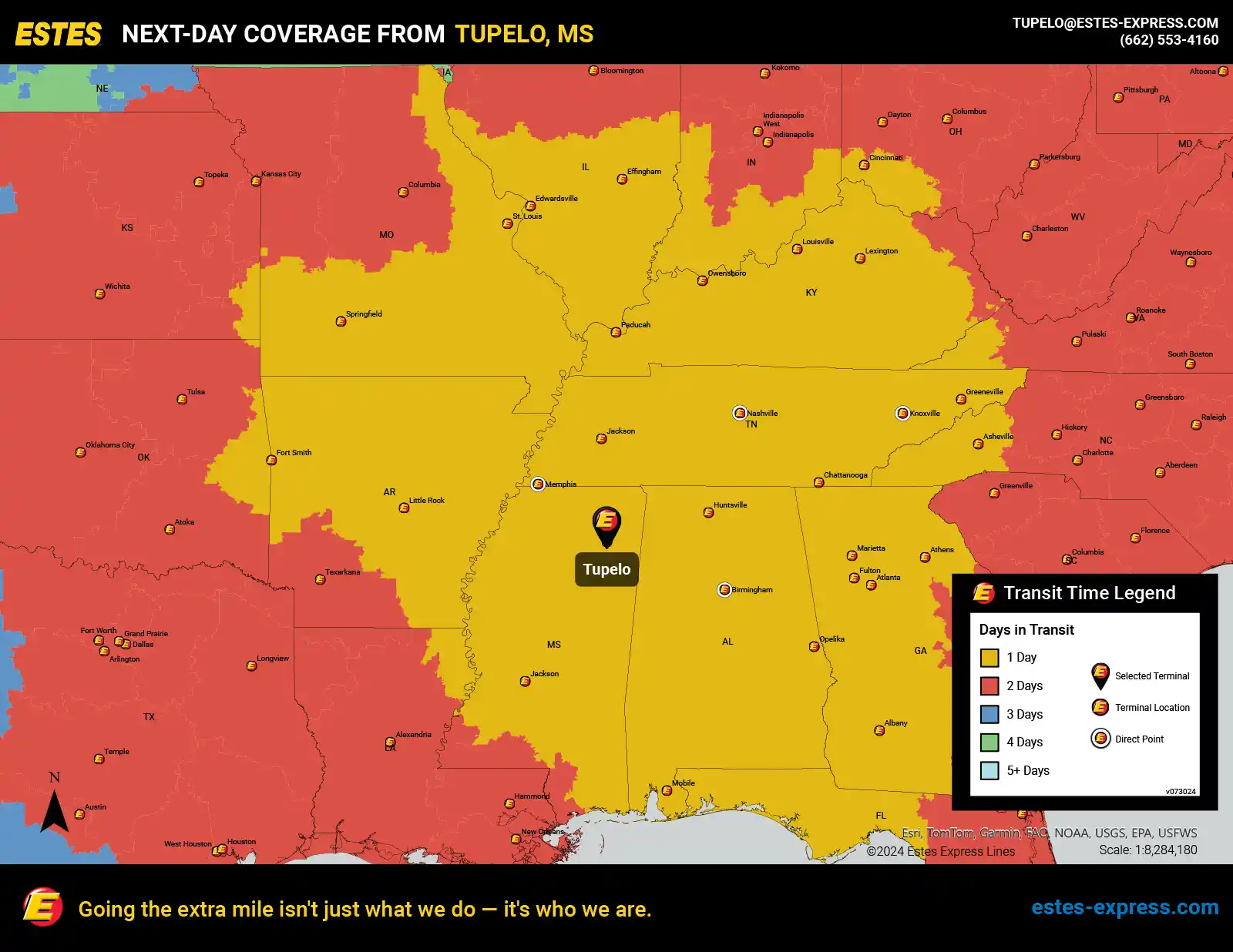 Estes offers next-day LTL freight shipping from the Tupelo-Columbus-Starkville area to Atlanta, Nashville, Cincinnati, Memphis, St. Louis, Louisville, Lexington, Mobile, Jackson, Little Rock, Knoxville—and more.