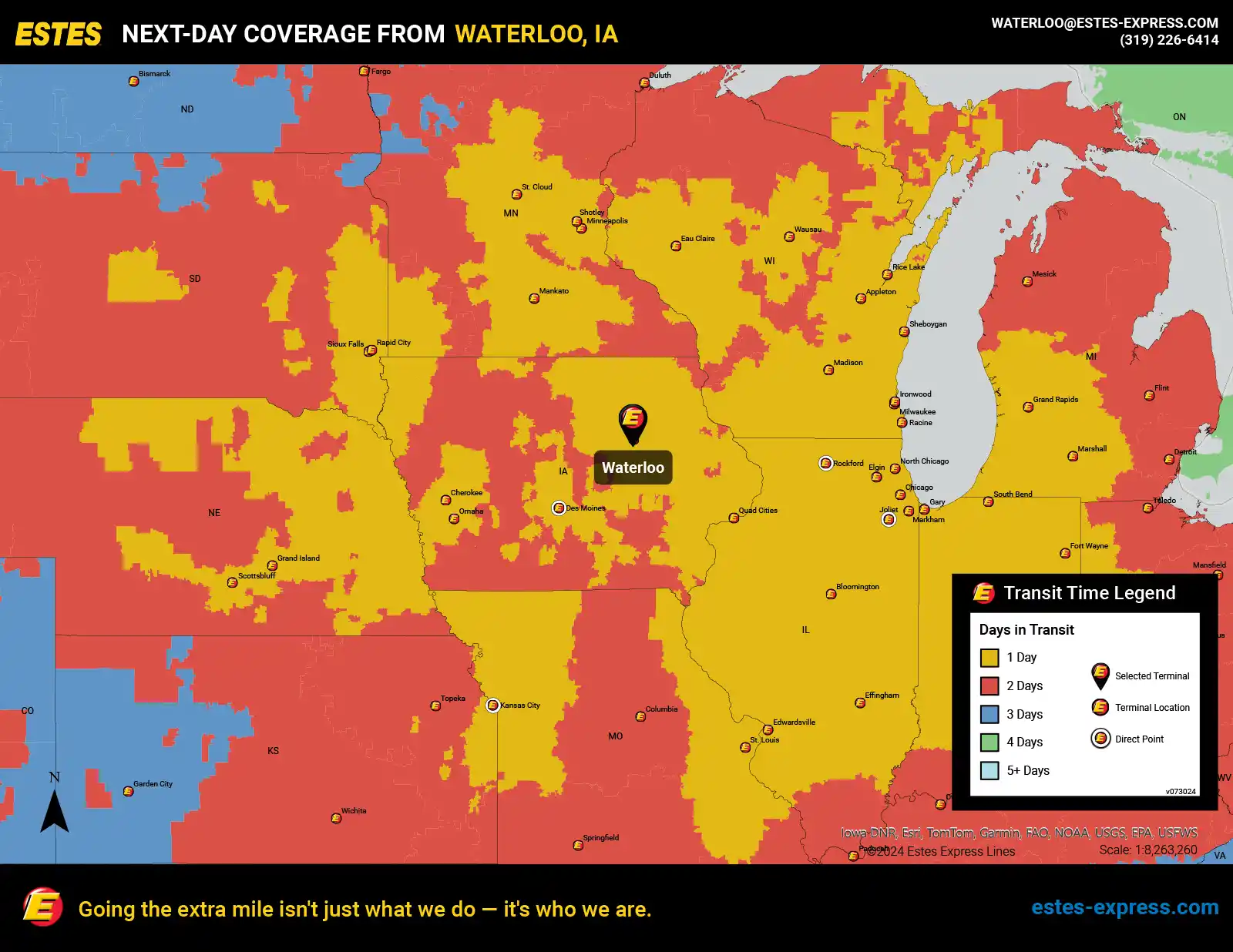 Estes offers next-day LTL freight shipping from the Cedar Rapids-Waterloo area to Chicago, Indianapolis, Kansas City, St. Louis, Omaha, Des Moines, Madison, Fort Wayne, Grand Rapids—and more.