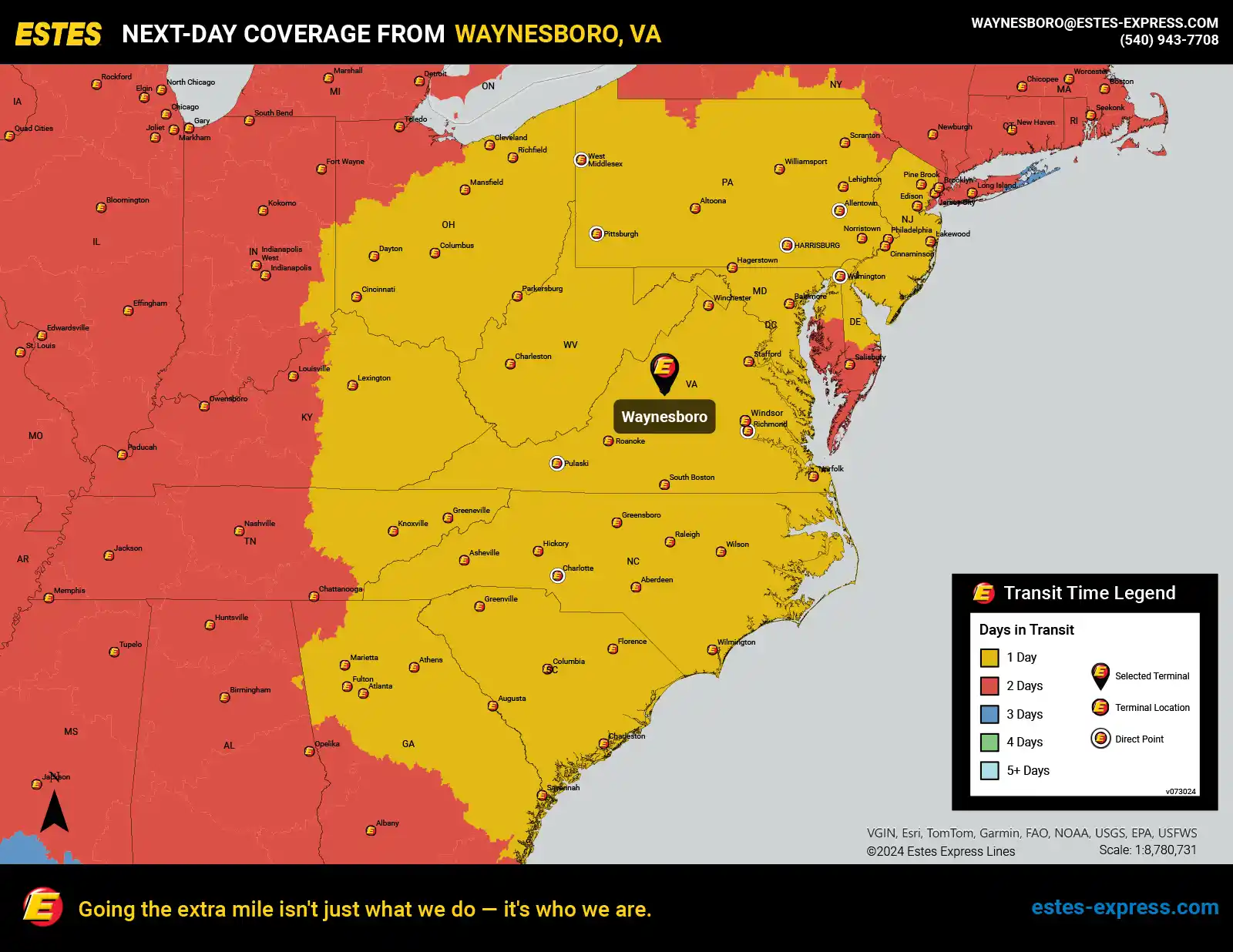 Estes offers next-day LTL freight shipping from the Charlottesville-Harrisonburg-Waynesboro area to Atlanta, Philadelphia, Charlotte, Cincinnati, Cleveland, Baltimore, Pittsburgh, Columbus, Raleigh, Richmond, Norfolk—and more.