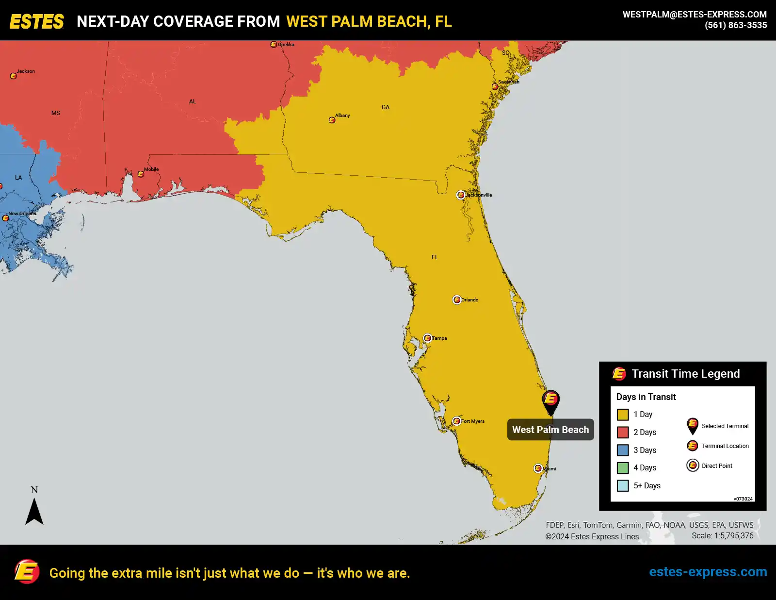 Estes offers next-day LTL freight shipping from the West Palm Beach-Port St. Lucie area to Miami, Jacksonville, Orlando, Tampa, Savannah, Fort Myers, Albany, Boynton Beach, and more.