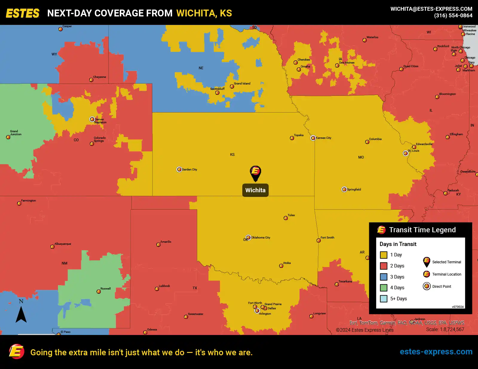 Estes offers next-day LTL freight shipping from Wichita to Dallas, Denver, Fort Worth, Oklahoma City, Memphis, Kansas City, Tulsa, St. Louis, Omaha, Little Rock, Topeka, Des Moines, Columbia—and more.