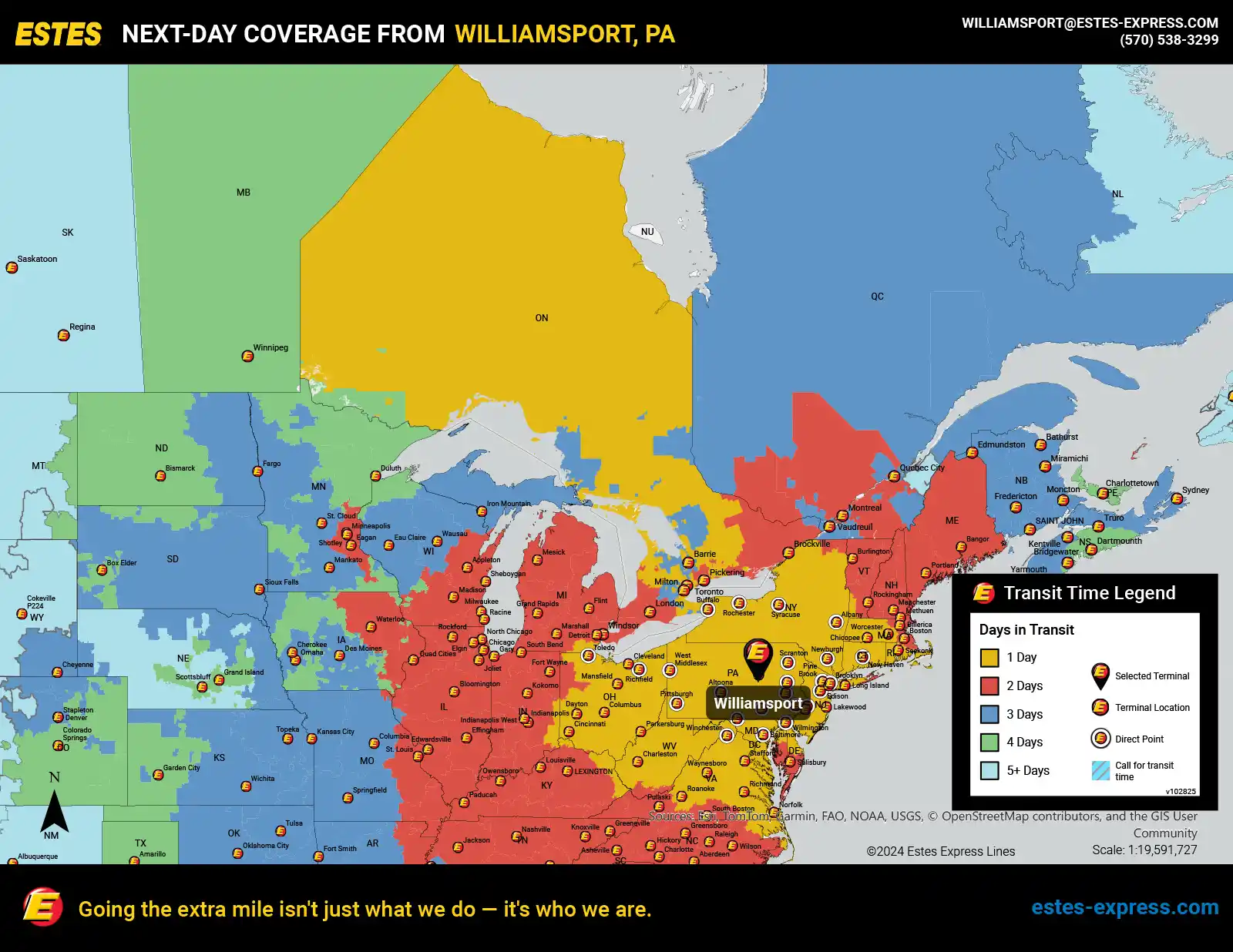 Estes offers next-day direct LTL freight shipping from the Williamsport-Elmira area to NYC, Philadelphia, Pittsburgh, Cleveland, Baltimore, Buffalo, New Haven, Syracuse, Toledo, Albany, and Wilmington, as well as next-day LTL to Cincinnati, Columbus, Toronto, Richmond, Norfolk, and more.