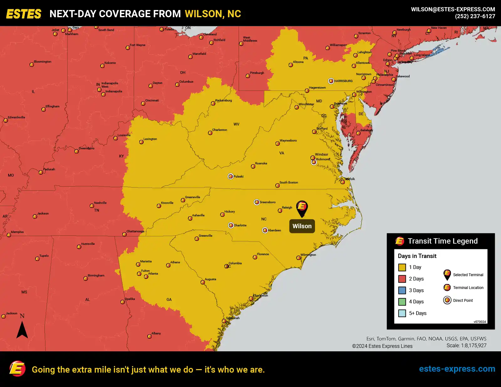 Estes offers next-day LTL freight shipping and trucking services from the Greenville-Wilson area to Atlanta, Philadelphia, Charlotte, DC, Baltimore, Raleigh, Lexington, Knoxville, Richmond, Norfolk, Greensboro, Columbia, Asheville—and more.